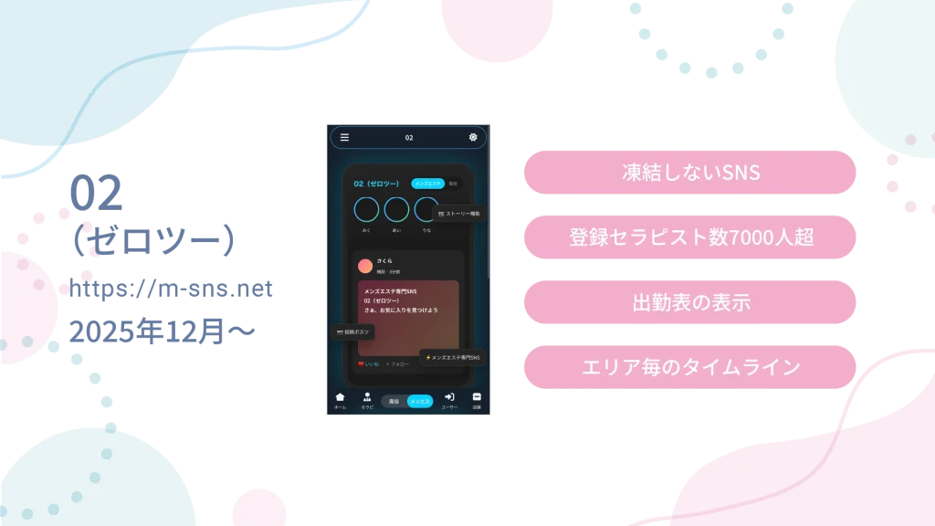 まず最初に広がったのが、02( https://m-sns.net/ )です。2025年12月にベータ版として誕生し、2026年3月より本格的にサービスが分用されました。実際に使ってみると、Xにかなり近い操作感で、ほとんど迷うことなく始められると思います。投稿やプロフィールの作り方も似ているので、新しいサービスにありがちなストレスが少ないのが特徴です。そして何より大きいのは、凍結を気にせず発信できるという安心感です。凍結しないSNSといううたい文句で誕生し、2026年4月現在では、セラピスト7127名、908店舗が登録されています。
